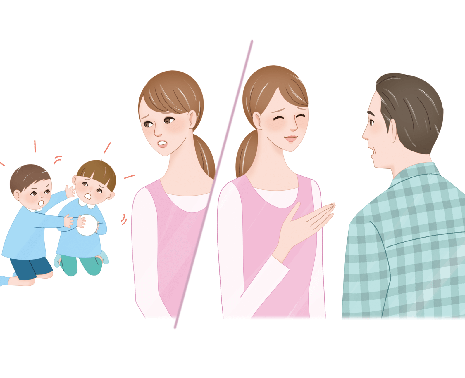 そのとき子供たちがケンカを始め、一人の子が泣き出してしまいました。金切り声が響き、険しい表情でこめかみを押さえるEさんでしたが、すぐ笑顔に切り替えて、