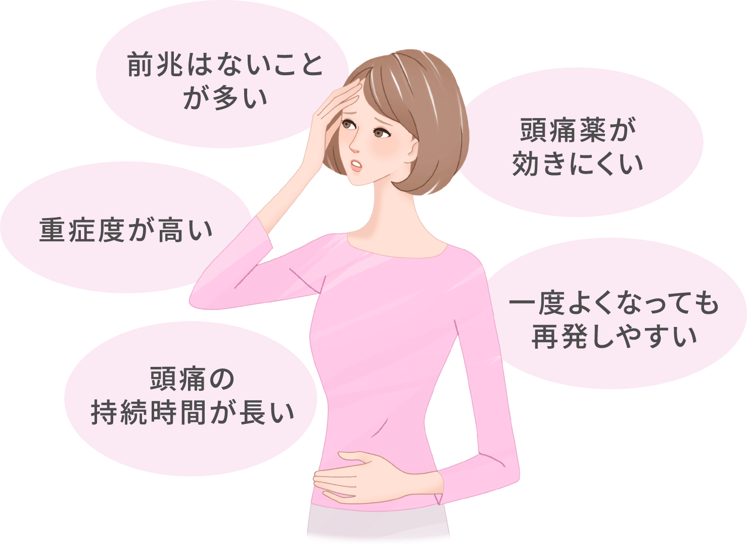 生理前から生理中に起こる片頭痛は前兆がないことが多く、他の時期に起こる頭痛に比べて、重症で持続時間が長く、一度よくなっても再発しやすいという特徴があります。また、頭痛薬を服用しても治りにくいため、患者さんの日常生活に重大な支障をきたしやすいといえます。